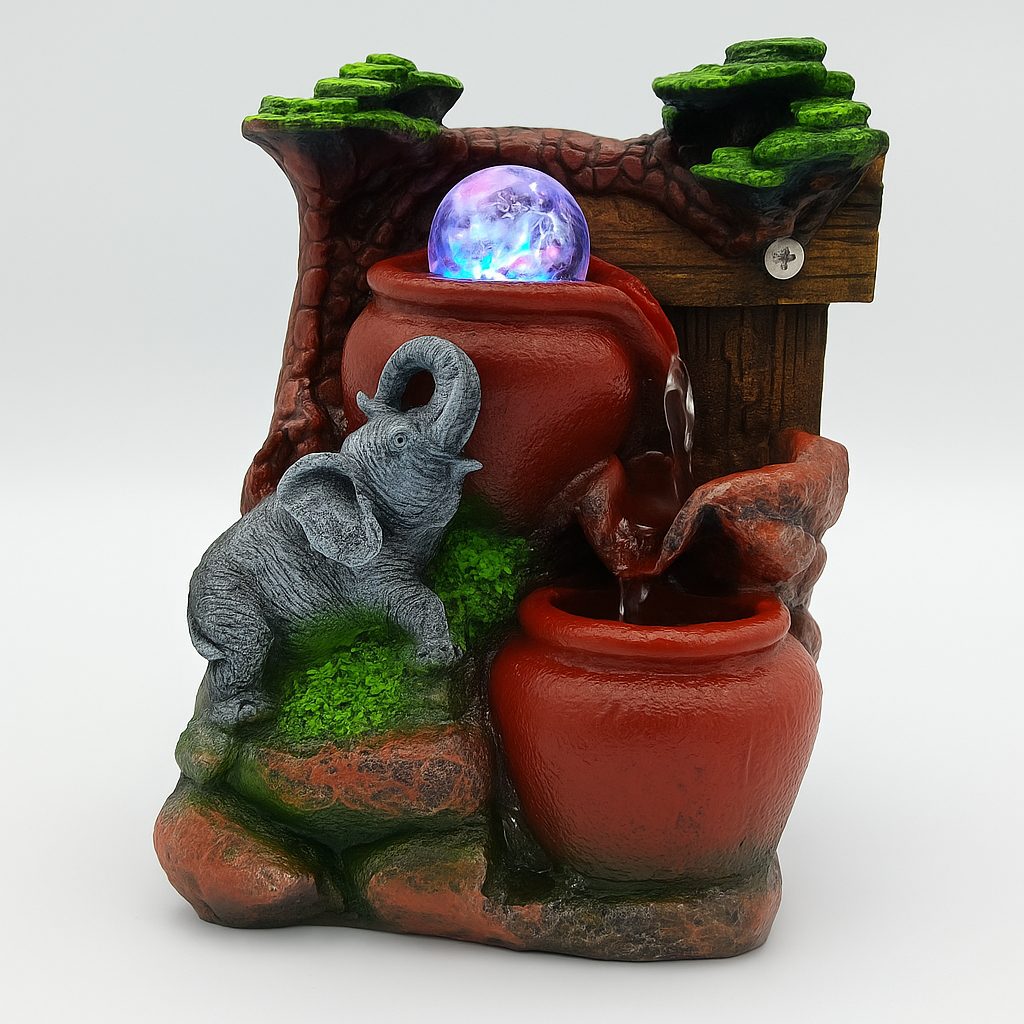 La pileta de agua decorativa modelo 8010 es una fuente ornamental diseñada para crear ambientes relajantes y llenos de armonía. Su diseño combina un elefante tallado, vasijas en tonos rojizos y una cascada con iluminación LED que aporta movimiento, brillo y un efecto visual muy agradable. Es perfecta para salas, dormitorios, oficinas, recepciones o tiendas, ya que añade energía positiva, belleza y un sonido suave de agua.